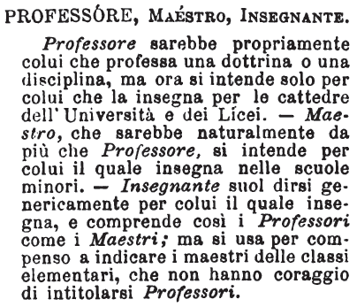| Professore, Maestro, Insegnante - Professore sarebbe propriamente colui che professa una dottrina o una disciplina, ma ora si intende solo per colui che la insegna per le cattedre dell'Università e dei Licei. - Maestro, che sarebbe naturalmente da più che Professore, si intende per colui il quale insegna nelle scuole minori. - Insegnante suol dirsi genericamente per colui il quale insegna, e comprende così i Professori come i Maestri; ma si usa per compenso a indicare i maestri delle classi elementari, che non hanno coraggio di intitolarsi Professori. [immagine] |