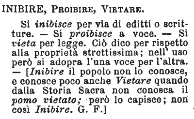 | Inibire, Proibire, Vietare - Si inibisce per via di editti o scritture. - Si proibisce a voce. - Si vieta per legge. Ciò dico per rispetto alla proprietà strettissima; nell'uso però si adopra l'una voce per l'altra. -[Inibire il popolo non lo conosce, e conosce poco anche Vietare quando dalla Storia Sacra non conosca il pomo vietato; però lo capisce; non così Inibire. G. F.] [immagine] |