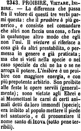 | Proibire, Vietare, Inibire - La differenza che passa fra il valore di questi tre verbi parmi questa: che il proibire è più generico, e consiste nel comandare che altri non faccia una cosa, o fare in qualunque altro modo che egli non l'usi. Il vietare si riferisce a cosa già da altri prestabilita, o permessa in genere e già praticata; ma che si vieti nella specie o nel caso speciale da chi ne ha o se ne arroga il potere. L'inibire è un proibire con maggiore energia, e con più prepotente arbitrio. Son proibite alle feste le opere servili (generalmente); sono vietate agli Ebrei e ai Maomettani le carni di certi animali detti da loro immondi (specie); era inibito al popolo mettere il piede nel santuario, e di pronunziare il nome santo di Ieova (sotto pene terribili). [immagine] |