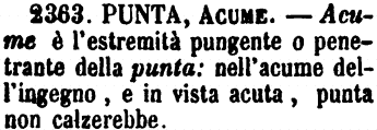 | Punta, Acume - Acume è l'estremità pungente o penetrante della punta: nell'acume dell'ingegno, e in vista acuta, punta non calzerebbe. [immagine] |