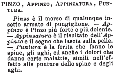 | Pinzo, Appinzo, Appinzatura, Puntura - Pinzo è il morso di qualunque insetto armato di pungiglione. - Appinzo è Pinzo più forte e più dolente. - Appinzatura è il risultato dell'Appinzo e il segno che lascia sulla pelle. - Puntura è la ferita che fanno le spine, gli aghi, ed anche i dolori che danno certe malattie, simili nell'effetto alle punture delle spine e degli aghi. [immagine] |