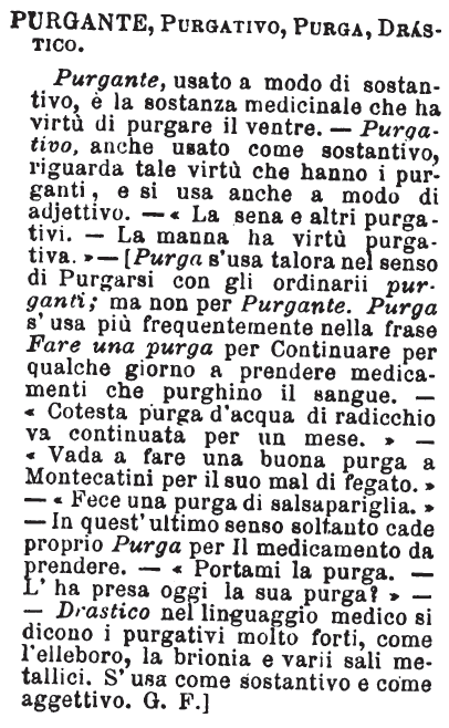 | Purgante, Purgativo, Purga, Drastico - Purgante, usato a modo di sostantivo, è la sostanza medicinale che ha virtù di purgare il ventre. - Purgativo, anche usato come sostantivo, riguarda tale virtù che hanno i purganti, e si usa anche a modo di adjettivo. - «La sena e altri purgativi. - La manna ha virtù purgativa.» - [Purga s'usa talora nel senso di Purgarsi con gli ordinarii purganti; ma non per Purgante. Purga s'usa più frequentemente nella frase Fare una purga per Continuare per qualche giorno a prendere medicamenti che purghino il sangue. - «Cotesta purga d'acqua di radicchio va continuata per un mese.» - «Vada a fare una buona purga a Montecatini per il suo mal di fegato.» - «Fece una purga di salsapariglia.» - In quest'ultimo senso soltanto cade proprio Purga per il medicamento da prendere. - «Portami la purga. - L'ha presa oggi la sua purga?» - Drastico nel linguaggio medico si dicono i purgativi molto forti, come l'elleboro, la brionia e varii sali metallici. S'usa come sostantivo e come aggettivo. G. F.] [immagine] |