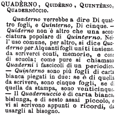 | Quaderno, Quiderno, Quinterno, Quadernuccio - Quaderno verrebbe a dire Di quattro fogli, e Quinterno, Di cinque. - Quiderno non è altro che una sconciatura popolare di Quinterno. Nell'uso comune, per altro, si dice Quaderno per Alquanti fogli uniti insieme, da scriverci conti, memorie, e cose di scuola; come pure si chiamano Quaderni i fascicoli di un periodico. - Quinterno sono più fogli di carta bianca piegati in due: se è di quella da scrivere, sono cinque fogli, se di quella da stampa, sono venticinque. - Il Quadernuccio è di carta bianca bislunga, e di sesto assai piccolo, e vi si scrivono appunti o ricordi, da usargli al bisogno. [immagine] |