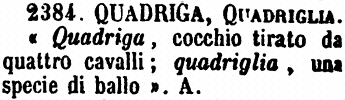 | Quadriga, Quadriglia - « Quadriga, cocchio tirato da quattro cavalli; quadriglia, una specie di ballo ». A. [immagine] |