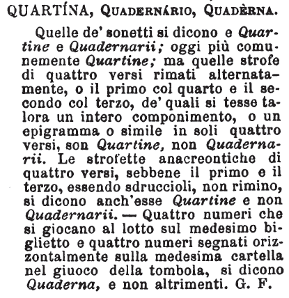 | Quartina, Quadernario, Quaderna - Quelle de' sonetti si dicono e Quartine e Quadernarii; oggi piu comunemente Quartine; ma quelle strofe di quattro versi rimati alternatamente, o il primo col quarto e il secondo col terzo, de' quali si tesse talora un intero componimento, o un epigramma o simile in soli quattro versi, son Quartine, non Quadernarii. Le strofette anacreontiche di quattro versi, sebbene il primo e il terzo, essendo sdruccioli, non rimino, si dicono anch'esse Quartine e non Quadernarii. - Quattro numeri che si giocano al lotto sul medesimo biglietto e quattro numeri segnati orizzontalmente sulla medesima cartella nel giuoco della tombola, si dicono Quaderna, e non altrimenti. G. F. [immagine] |