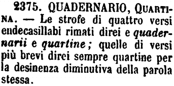 | Quadernario, Quartina - Le strofe di quattro versi endecasillabi rimati direi e quadernarii e quartine; quelle di versi più brevi direi sempre quartine per la desinenza diminutiva della parola stessa. [immagine] |