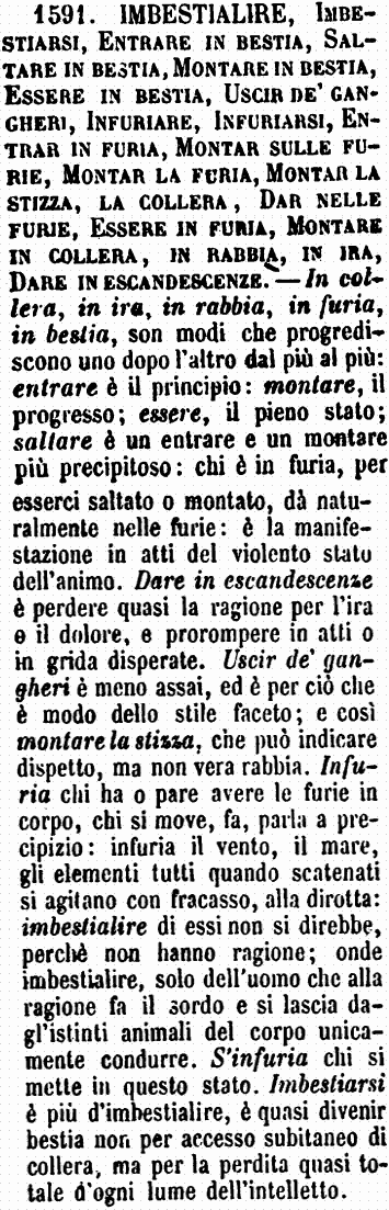 | Imbestialire, Imbestiarsi, Entrare in bestia, Saltare in bestia, Montare in bestia, Essere in bestia, Uscir de’ gangheri, Infuriare, Infuriarsi, Entrar in furia, Montar sulle furie, Montar la furia, Montar la stizza, La collera, Dar nelle furie, Essere in furia, Montare in collera, in rabbia, in ira, Dare in escandescenze - In collera, in ira, in rabbia, in furia, in bestia, son modi che progrediscono uno dopo l'altro dal più al più: entrare è il principio: montare, il progresso; essere, il pieno stato; saltare è un entrare e un montare più precipitoso: chi è in furia, per esserci saltato o montato, dà naturalmente nelle furie: è la manifestazione in atti del violento stato dell'animo. Dare in escandescenze è perdere quasi la ragione per l'ira e il dolore, e prorompere in atti o in grida disperate. Uscir de' gangheri è meno assai, ed è per ciò che è modo dello stile faceto; e così montare la stizza, che può indicare dispetto, ma non vera rabbia. Infuria chi ha o pare avere le furie in corpo, chi si move, fa, parla a precipizio: infuria il vento, il mare, gli elementi tutti quando scatenati si agitano con fracasso, alla dirotta: imbestialire di essi non si direbbe, perché non hanno ragione; onde imbestialire, solo dell'uomo che alla ragione fa il sordo e si lascia dagl'istinti animali del corpo unicamente condurre. S'infuria chi si mette in questo stato. Imbestiarsi è più d'imbestialire, è quasi divenir bestia non per accesso subitaneo di collera, ma per la perdita quasi totale d'ogni lume dell'intelletto. [immagine] |