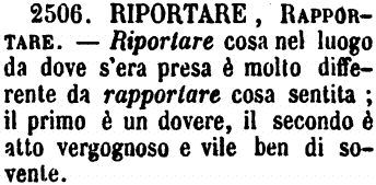 | Riportare, Rapportare - Riportare cosa nel luogo da dove s'era presa è molto differente da rapportare cosa sentita; il primo è un dovere, il secondo è atto vergognoso e vile ben di sovente. [immagine] |