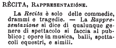 | Recita, Rappresentazione - La Recita è solo delle commedie, drammi e tragedie. - La Rappresentazione si dice di qualunque genere di spettacolo si faccia al pubblico; opere in musica, balli, spettacoli equestri, e simili. [immagine] |