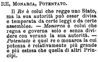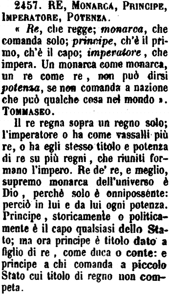 | Re, Monarca, Principe, Imperatore, Potenza - «Re, che regge; monarca, che comanda solo; principe, ch'è il primo, ch'è il capo; imperatore, che impera. Un monarca come monarca, un re come re, non può dirsi potenza, se non comanda a nazione che può qualche cosa nel mondo». Tommaseo.