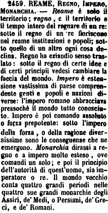 | Reame, Regno, Impero, Monarchia - Reame è il solo territorio. - Regno è il territorio e il tempo intero del regnare del re. - «Sotto il regno di un re fioriscono nel reame le istituzioni e i popoli; sotto quello di un altro ogni cosa declina.» - Regno ha eziandio senso traslato. - «Sotto il regno di certe idee e di certi principii, vedesi cambiare la faccia del mondo.» - Impero è estensione vastissima di paese comprendente genti e popoli e nazioni diverse. L'Impero romano abbracciava pressochè il mondo tutto conosciuto. - Impero è poi comando assoluto o forza prepotente. [immagine] |