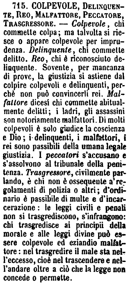 | Colpevole, Delinquente, Reo, Malfattore, Peccatore, Trasgressore - Colpevole, chi commette colpa; ma talvolta si riesce o appare colpevole per imprudenza. Delinquente, chi commette delitto. Reo, chi è riconosciuto delinquente. Sovente, per mancanza di prove, la giustizia si astiene dal colpire colpevoli e delinquenti, perchè non può convincerli rei. Malfattore dicesi chi commette abitualmente delitti; i ladri, gli assassini son notoriamente malfattori. Di molti colpevoli è solo giudice la coscienza e Dio; i delinquenti, i malfattori, i rei sono passibili della umana legale giustizia. I peccatori s'accusano e s'assolvono al tribunale della penitenza. Trasgressore, civilmente parlando, è chi non è ossequente a' regolamenti di polizia o altri; d'ordinario è passibile di multe e d'incarcerazione: le leggi civili e penali non si trasgrediscono, s'infrangono: chi trasgredisce ai principii della morale e alle leggi divine può essere colpevole ed eziandio malfattore: nel trasgredire il male sta nell'eccesso, cioè nel trascendere e nell'andare oltre a ciò che la legge non concede o permette. [immagine] |