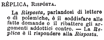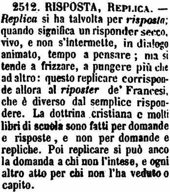 | Risposta, Replica - Replica si ha talvolta per risposta; quando significa un risponder secco, vivo, e non s'intermette, in dialogo animato, tempo a pensare; ma si tende a frizzare, a pungere più che ad altro: questo replicare corrisponde allora al riposter de' Francesi, che è diverso dal semplice rispondere. La dottrina cristiana e molti libri di scuola sono fatti per domande e risposte, e non per domande e repliche. Poi replicare si può anco la domanda a chi non l'intese, e ogni altro atto per chi non l'ha veduto o capito. [immagine] |