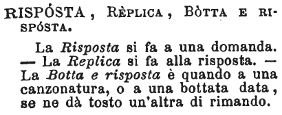 | Risposta, Replica, Botta e risposta - La Risposta si fa a una domanda. - La Replica si fa alla risposta. - La Botta e risposta è quando a una canzonatura, o a una bottata data, se ne dà tosto un'altra di rimando. [immagine] |