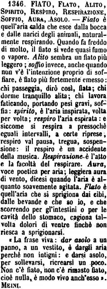 | Fiato, Flato, Alito, Spirito, Respiro, Respirazione, Soffio, Aura, Asolo - Fiato è quell'aria calda che esce dalla bocca e dalle narici degli animali, naturalmente respirando. Quando fa freddo di molto, il fiato si vede quasi fumo o vapore. Alito sembra un fiato più leggero; soffio invece, anche quando non v'è l'intenzione proprio di soffiare, è fiato più fortemente emesso: chi passeggia, dirò così, fiata; chi dorme tranquillo alita; chi lavora faticando, portando pesi gravi, soffia: spirito, è l'aria inspirata, volta per volta; respiro l'aria espirata: e siccome si respira a pressochè eguali intervalli, a certe riprese, respiro val pausa, tregua, sospensione: il respiro è un accidente della musica. Respirazione è l'atto e la facoltà del respirare. Aura, voce poetica per aria; leggiera aura di vento, dicesi quando l'aria è alquanto soavemente agitata. Flato è quell'aria che si sprigiona dai cibi, dalle bevande e che so io, e che scorrendo per gl'intestini o per le cavità dello stomaco, cagiona talvolta dolori di ventre finchè non riesca a sprigionarsi.