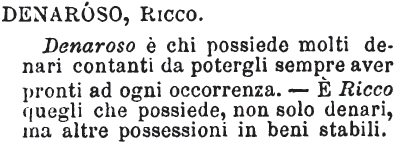 | Denaroso, Ricco - Denaroso è chi possiede molti denari contanti da potergli sempre aver pronti ad ogni occorrenza. - E' Ricco quegli che possiede, non solo denari, ma altre possessioni in beni stabili. [immagine] |