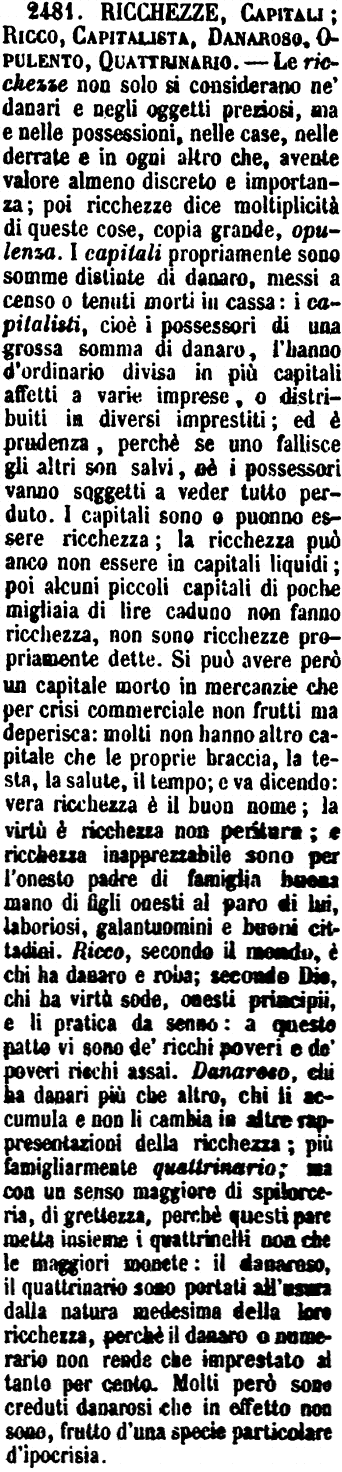 | Ricchezze, Capitali; Ricco, Capitalista, Danaroso, Opulento, Quattrinario - Le ricchezze non solo si considerano ne' danari e negli oggetti preziosi, ma e nelle possessioni, nelle case, nelle derrate e in ogni altro che, avente valore almeno discreto e importanza; poi ricchezze dice moltiplicità di queste cose, copia grande, opulenza. I capitali propriamente sono somme distinte di danaro, messi a censo o tenuti morti in cassa: i capitalisti, cioè i possessori di una grossa somma di danaro, l'hanno d'ordinario divisa in più capitali affetti a varie imprese, o distribuiti in diversi imprestiti; ed è prudenza, perchè se uno fallisce gli altri son salvi, nè i possessori vanno soggetti a veder tutto perduto. I capitali sono o puonno essere ricchezza; la ricchezza può anco non essere in capitali liquidi; poi alcuni piccoli capitali di poche migliaia di lire caduno non fanno ricchezza, non sono ricchezze propriamente dette. Si può avere però un capitale morto in mercanzie che per crisi commerciale non frutti ma deperisca: molti non hanno altro capitale che le proprie braccia, la testa, la salute, il tempo; e va dicendo: vera ricchezza è il buon nome; la virtù è ricchezza non peritura; e ricchezza inapprezzabile sono per l'onesto padre di famiglia buona mano di figli onesti al paro di lui, laboriosi, galantuomini e buoni cittadini. Ricco, secondo il mondo, è chi ha danaro e roba; secondo Dio, chi ha virtù sode, onesti principii, e li pratica da senno: a questo patto vi sono de' ricchi poveri e de' poveri ricchi assai. Danaroso, chi ha danari più che altro, chi li accumula e non li cambia in altre rappresentazioni della ricchezza; più famigliarmente quattrinario; ma con un senso maggiore di spilorceria, di grettezza, perchè questi pare metta insieme i quattrinelli non che le maggiori monete: il danaroso, il quattrinario sono portati all'usura dalla natura medesima della loro ricchezza, perchè il danaro o numerario non rende che imprestato al tanto per cento. Molti però sono creduti danarosi che in effetto non sono, frutto d'una specie particolare d'ipocrisia. [immagine] |