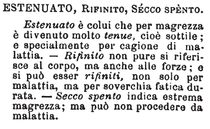 | Estenuato, Rifinito, Secco spento - Estenuato è colui che per magrezza è divenuto molto tenue, cioè sottile; e specialmente per cagione di malattia. - Rifinito non pure si riferisce al corpo, ma anche alle forze; e si può esser rifiniti, non solo per malattia, ma per soverchia fatica durata. - Secco spento indica estrema magrezza; ma può non procedere da malattia. [immagine] |