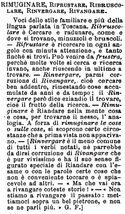 | Ribruscolare, Rifrustare, Rinvergare, Rimuginare - Voci dello stile famigliare e più della lingua parlata in Toscana. Ribruscolare è cercare e radunare come e dove si trovano minuzzoli e bruscoli. Rifrustare è ricercare in ogni angolo con minuta attenzione, e tanto finchè si trovi: può venire da frustra, perchè molte volte si cerca e ricerca invano, anco riuscendo in ultimo a trovare. Rinvergare parmi corruzione di rivangare, cioè cercare ben addentro, rimestando cose accumulate da anni e da tempo; il rinvergare però dice eziandio il trovare, cioè il frutto della ricerca. Rimuginare è riandare nella mente cosa e cosa, per trovarne il nesso, l'analogia: a forza di rimuginare le cose o sulle cose si scoprono certe circostanze che a prima visita non apparivano. [immagine] |