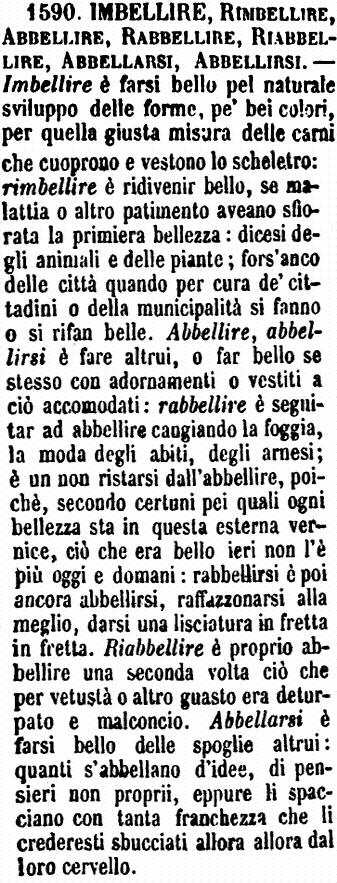 | Imbellire, Abbellire, Riabbellire, Rabbellire, Rimbellire - Imbellire non s'usa oramai che come neutro, e soltanto riferito a persone, per Divenir bello. - «Quella bambina, dopo la malattia, cominciò a imbellire. - Com'è imbellita da due anni che non l'avevo veduta!» - Abbellire s'usa come attivo e come neutro passivo per Fare e per Farsi bello, parlando di persone e di cose. «Ornamenti che abbelliscono la terra.» (Galileo). - «Abbellire una casa, una città.» - «Donna che s'abbellisce allo specchio - con gioje.» - «Pettinatura che abbellisce di molto.» - «Abbellire la virtù - l'ingegno - la mente.» - Riabbellire, sempre attivo o riflessivo, è Abbellire o Abbellirsi di nuovo. - «Riabbellire una chiesa.» - «Donna che tenta riabbellirsi con ornamenti, con belletti, che la facciano apparir bella come una volta.» - «Città che dopo il terremoto si riabbellisce.» - «Infonde nell'anima la grazia santificante, che è la morte dell'istesso peccato; e, riabbellendola, la fa spesso degna di Dio.» (Segneri). - Rabbellire è più comune negli scritti che nel linguaggio familiare, e differisce in questo da Riabbellire, che dice l'abbellire più che mai, mentre quello dice l'abbellire di nuovo, e che può significare Abbellire alquanto, Abbellire alla meglio.