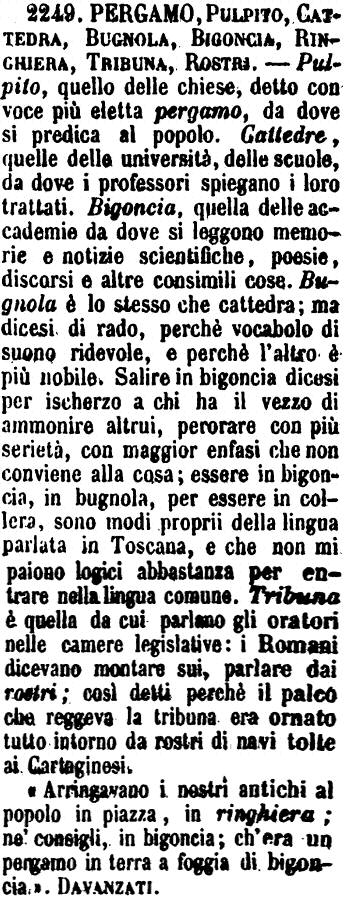 | Pergamo, Pulpito, Cattedra, Bugnola, Bigoncia, Ringhiera, Tribuna, Rostri - Pulpito, quello delle chiese, detto con voce più eletta pergamo, da dove si predica al popolo. Cattedre, quelle delle università, delle scuole, da dove i professori spiegano i loro trattati. Bigoncia, quella delle accademie da dove si leggono memorie e notizie scientifiche, poesie, discorsi e altre consimili cose. Bugnola è lo stesso che cattedra; ma dicesi di rado, perchè vocabolo di suono ridevole, e perchè l'altro è più nobile. Salire in bigoncia dicesi per ischerzo a chi ha il vezzo di ammonire altrui, perorare con più serietà, con maggior enfasi che non conviene alla cosa; essere in bigoncia, in bugnola, per essere in collera, sono modi proprii della lingua parlata in Toscana, e che non mi paiono logici abbastanza per entrare nella lingua comune. Tribuna è quella da cui parlano gli oratori nelle camere legislative: i Romani dicevano montare sui, parlare dai rostri; così detti perchè il palco che reggeva la tribuna era ornato tutto intorno da rostri di navi tolte ai Cartaginesi.