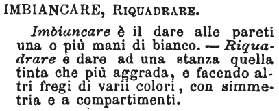 | Imbiancare, Riquadrare - Imbiancare è il dare alle pareti una o più mani di bianco. — Riquadrare è dare ad una stanza quella tinta che più aggrada, e facendo altri fregi di varii colori, con simmetria e a compartimenti. [immagine] |