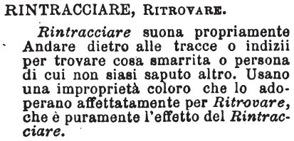 | Rintracciare, Ritrovare - Rintracciare suona propriamente Andare dietro alle tracce o indizii per trovare cosa smarrita o persona di cui non siasi saputo altro. Usano una improprietà coloro che lo adoperano affettatamente per Ritrovare, che è puramente l'effetto del Rintracciare. [immagine] |