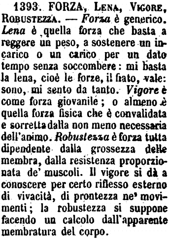 | Forza, Lena, Vigore, Robustezza - Forza è generico. Lena è quella forza che basta a reggere un peso, a sostenere un incarico o un carico per un dato tempo senza soccombere: mi basta la lena, cioè le forze, il fiato, vale: sono, mi sento da tanto. Vigore è come forza giovanile; o almeno è quella forza fisica che è convalidata e sorretta dalla non meno necessaria dell'animo. Robustezza è forza tutta dipendente dalla grossezza delle membra, dalla resistenza proporzionata de' muscoli. Il vigore si dà a conoscere per certo riflesso esterno di vivacità, di prontezza ne' movimenti; la robustezza si suppone facendo un calcolo dall'apparente membratura del corpo. [immagine] |