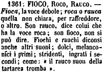 | Fioco, Roco, Rauco - Fioca, la voce debole; roca o rauca quella non chiara, per raffreddore, o altro. Son rauco, dice colui che ha la voce roca; son fioco, non si può dire. Fiochi e rauchi diconsi anche altri suoni; dolci, melanconici i primi; stridenti, ingrati i secondi; come: «il rauco suon della tartarea tromba». [immagine] |