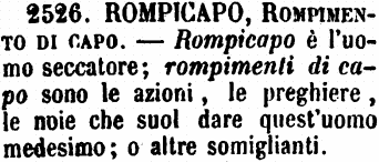 | Rompicapo, Rompimento di capo - Rompicapo è l'uomo seccatore; rompimenti di capo sono le azioni, le preghiere, le noie che suol dare quest'uomo medesimo; o altre somiglianti. [immagine] |