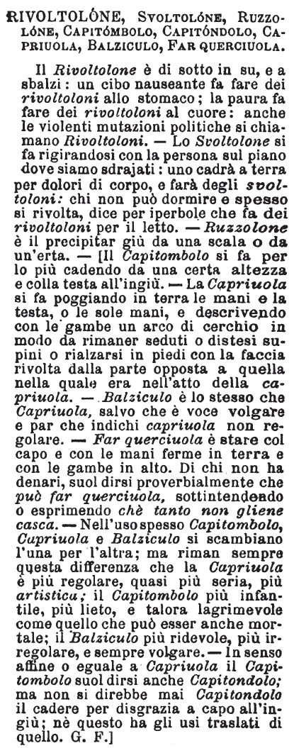 | Rivoltolone, Svoltolone, Ruzzolone, Capitombolo, Capitondolo, Capriuola, Balziculo, Far querciuola - Il Rivoltolone è di sotto in su, e a sbalzi: un cibo nauseante fa fare dei rivoltoloni allo stomaco; la paura fa fare dei rivoltoloni al cuore: anche le violenti mutazioni politiche si chiamano Rivoltoloni. - Lo Svoltolone si fa rigirandosi con la persona sul piano dove siamo sdrajati: uno cadrà a terra per dolori di corpo, e farà degli svoltoloni: chi non può dormire e spesso si rivolta, dice per iperbole che fa dei rivoltoloni per il letto. - Ruzzolone è il precipitar giù da una scala o da un'erta. - [Il Capitombolo si fa per lo più cadendo da una certa altezza e colla testa all'ingiù. - La Capriuola si fa poggiando in terra le mani e la testa, o le sole mani, e descrivendo con le gambe un arco di cerchio in modo da rimaner seduti o distesi supini o rialzarsi in piedi con la faccia rivolta dalla parte opposta a quella nella quale era nell'atto della capriuola. - Balziculo è lo stesso che Capriuola, salvo che è voce volgare e par che indichi capriuola non regolare. - Far querciuola è stare col capo e con le mani ferme in terra e con le gambe in alto. Di chi non ha denari, suol dirsi proverbialmente che può far querciuola, sottintendendo o esprimendo chè tanto non gliene casca. - Nell'uso spesso Capitombolo, Capriuola e Balziculo si scambiano l'una per l'altra; ma riman sempre questa differenza che la Capriuola è più regolare, quasi più seria, più artistica; il Capitombolo più infantile, più lieto, e talora lagrimevole come quello che può esser anche mortale; il Balziculo più ridevole, più irregolare, e sempre volgare. - In senso affine o eguale a Capriuola il Capitombolo suol dirsi anche Capitondolo; ma non si direbbe mai Capitondolo il cadere per disgrazia a capo all'ingiù; nè questo ha gli usi traslati di quello. G. F.] [immagine] |