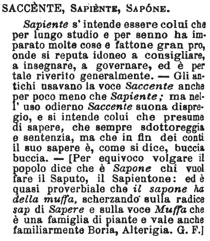 | Saccente, Sapiente, Sapone - Sapiente s'intende essere colui che per lungo studio e per senno ha imparato molte cose e fattone gran pro, onde si reputa idoneo a consigliare, a insegnare, a governare, ed è per tale riverito generalmente. - Gli antichi usavano la voce Saccente anche per poco meno che Sapiente; ma nell'uso odierno Saccente suona dispregio, e si intende colui che presume di sapere, che sempre sdottoreggia e sentenzia, ma che in fin dei conti il suo sapere è, come si dice, buccia buccia. - [Per equivoco volgare il popolo dice che è Sapone chi vuol fare il Saputo, il Sapientone: ed è quasi proverbiale che il sapone ha della muffa, scherzando sulla radice sap di Sapere e sulla voce Muffa che è una famiglia di piante e vale anche familiarmente Boria, Alterigia. G. F.] [immagine] |