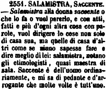 | Salamistra, Saccente - Salamistra alla donna saccente o che lo fa o vuol parerlo, e con atti, fatti e più d'ogni altra cosa con parole, vuol dirigere le cose non solo di casa sua, ma quelle di casa d'altri come se niuno sapesse fare e dire meglio di lei: salamistra, notano gli etimologisti, quasi maestra di sala. Saccente è dell'uomo ordinariamente, e mi sa di pedante e d'arrogante che molte volte è tutt'uno. [immagine] |