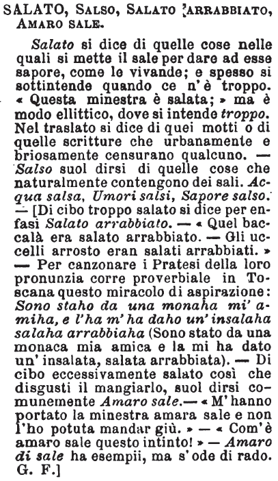 Salato, Salso, Salato arrabbiato, Amaro sale - Salato si dice di quelle cose nelle quali si mette il sale per dare ad esse sapore, come le vivande; e spesso si sottintende quando ce n'è troppo. «Questa minestra è salata;» ma è modo ellittico, dove si intende troppo. Nel traslato si dice di quei motti o di quelle scritture che urbanamente e briosamente censurano qualcuno. - Salso suol dirsi di quelle cose che naturalmente contengono dei sali. Acqua salsa, Umori salsi. Sapore salso. - [Di cibo troppo salato si dice per enfasi Salato arrabbiato. - «Quel baccalà era salato arrabbiato. - Gli uccelli arrosto eran salati arrabbiati.» - Per canzonare i Pratesi della loro pronunzia corre proverbiale in Toscana questo miracolo di aspirazione: Sono staho da una monaha mi' amiha, e l'ha m'ha daho un'insalaha salaha arrabbiaha (Sono stato da una monaca mia amica e la mi ha dato un'insalata, salata arrabbiata). - Di cibo eccessivamente salato così che disgusti il mangiarlo, suol dirsi comunemente Amaro sale. - «M'hanno portato la minestra amara sale e non l'ho potuta mandar giù.» - «Com'è amaro sale questo intinto!» - Amaro di sale ha esempii, ma s'ode di rado. G. F.] [immagine]