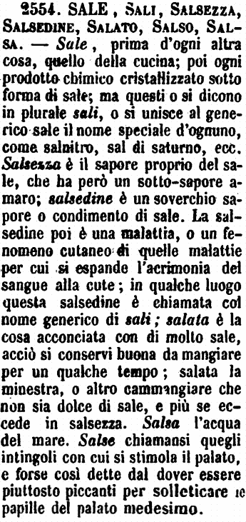 Sale, Sali, Salsezza, Salsedine, Salato, Salso, Salsa - Sale, prima d'ogni altra cosa, quello della cucina; poi ogni prodotto chimico cristallizzato sotto forma di sale; ma questi o si dicono in plurale sali, o si unisce al generico sale il nome speciale d'ognuno, come salnitro, sal di saturno, ecc. Salsezza è il sapore proprio del sale, che ha però un sotto-sapore amaro; salsedine è un soverchio sapore o condimento di sale. La salsedine poi è una malattia, o un fenomeno cutaneo di quelle malattie per cui si espande l'acrimonia del sangue alla cute; in qualche luogo questa salsedine è chiamata col nome generico di sali; salata è la cosa acconciata con di molto sale, acciò si conservi buona da mangiare per un qualche tempo; salata la minestra, o altro cammangiare che non sia dolce di sale, e più se eccede in salsezza. Salsa l'acqua del mare. Salse chiamansi quegli intingoli con cui si stimola il palato, e forse così dette dal dover essere piuttosto piccanti per solleticare le papille del palato medesimo. [immagine]