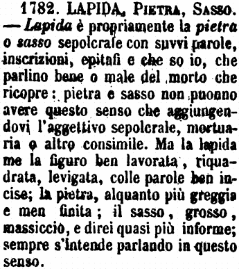 | Lapida, Pietra, Sasso - Lapida è propriamente la pietra o sasso sepolcrale con suvvi parole, inscrizioni, epitafi e che so io, che parlino bene o male del morto che ricopre: pietra e sasso non puonno avere questo senso che aggiungendovi l'aggettivo sepolcrale, mortuaria o altro consimile. Ma la lapida me la figuro ben lavorata, riquadrata, levigata, colle parole ben incise; la pietra, alquanto più greggia e men finita; il sasso, grosso, massiccio, e direi quasi più informe; sempre s'intende parlando in questo senso. [immagine] |