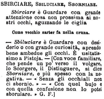 - Sbiluciare è Guardare con desiderio o con grande curiosità, aprendo bene ambedue gli occhi. E' usitatissimo a Pistoja. - [Con voce familiare, che pende un po' verso il volgare, lo Scorgere, il Distinguere, si dice Sborniare, e più spesso con la negativa. - «Senza gli occhiali non ci sbornio.» - «Con quel bujo e con quella confusione non lo potei sborniare.» G. F.] [immagine]