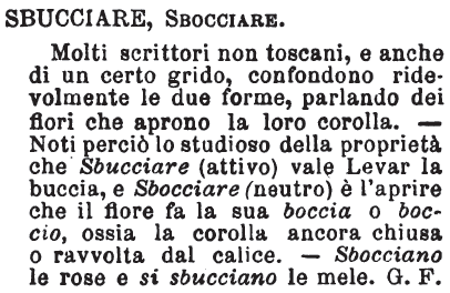 | Sbucciare, Sbocciare - Molti scrittori non toscani, e anche di un certo grido, confondono ridevolmente le due forme, parlando dei fiori che aprono la loro corolla. - Noti perciò lo studioso della proprietà che Sbucciare (attivo) vale Levar la buccia, e Sbocciare (neutro) è l'aprire che il fiore fa la sua boccia o boccio, ossia la corolla ancora chiusa o ravvolta dal calice. - Sbocciano le rose e si sbucciano le mele. G. F. [immagine] |
