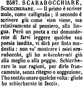 | Scarabocchiare, Schiccherare - Il primo è scriver male, come calligrafia; il secondo è scrivere giù come vien viene, ma relativamente al pensiero, alla lingua. Però un poeta a cui domanderete di farvi leggere qualche sua poesia inedita, vi dirà per finta modestia: non vo' mostrare i miei scarabocchi, gli ho schiccherati giù alla meglio o alla peggio. Schiccherare le sue ragioni, per dirle francamente, senza ritegno o soggezione, l'ho sentito usare qualche volta: gliele ho schiccherate in faccia. [immagine] |