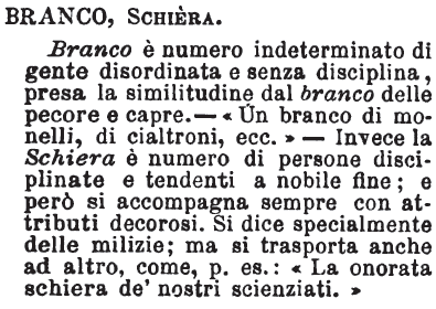 | Branco, Schiera - Branco è numero indeterminato di gente disordinata e senza disciplina, presa la similitudine del branco delle pecore e capre. - «Un branco di monelli, di cialtroni, ecc.» - Invece la Schiera è numero di persone disciplinate e tendenti a nobile fine; e però si accompagna sempre con attributi decorosi. Si dice specialmente delle milizie; ma si trasporta anche ad altro, come, p. es.: «La onorata schiera de' nostri scienziati.» [immagine] |