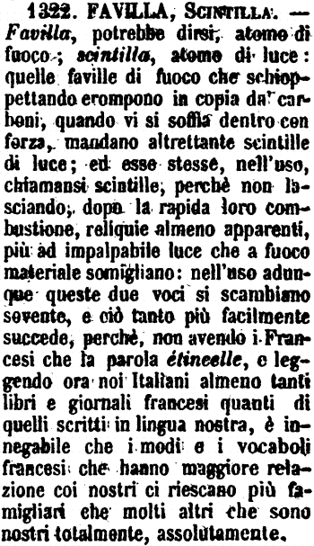 | Favilla, Scintilla, Favolesca, Monachine - Favilla è propriamente un piccolo sprazzo di fuoco già acceso, od è anche reliquia di fuoco. - Scintilla è invece potenza e principio di fuoco. La scintilla elettrica ciascuno sa di quanta potenza sia, e niuno la direbbe favilla, come mal si chiamerebbero faville le scintille della selce, che Virgilio chiamò da suo pari semina flammae. Anche dalla favilla per altro può appiccarsi il fuoco, benchè sia reliquia di fuoco; e Dante disse: