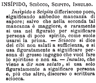 | Insipido, Sciocco, Scipito, Insulso - Insipido e Scipito differiscono poco, significando ambedue mancanza di sapore; salvo che nella seconda tal mancanza è maggiore, e raramente si usa nel figurato per significare persona di poco spirito, come suole usarsi la prima. - Sciocco si dice dei cibi non salati a sufficienza, e si usa figuratamente a significare persona di grosso ingegno che vuol fare lo spiritoso e non sa. - Insulso, che viene a dir non salato, si usa solo figuratamente a significare persona e, più che altro, discorso o scrittura sciocca. [immagine] |