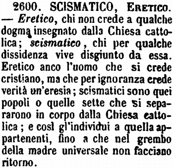 | Scismatico, Eretico - Eretico, chi non crede a qualche dogma insegnato dalla Chiesa cattolica; scismatico, chi per qualche dissidenza vive disgiunto da essa. Eretico anco l'uomo che si crede cristiano, ma che per ignoranza crede verità un'eresia; scismatici sono quei popoli o quelle sette che si separarono in corpo dalla Chiesa cattolica; e così gl'individui a quella appartenenti, fino a che nel grembo della madre universale non facciano ritorno. [immagine] |