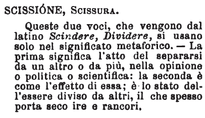 | Scissione, Scissura - Queste due voci, che vengono dal latino Scindere, Dividere, si usano solo nel significato metaforico. - La prima significa l'atto del separarsi da un altro o da più, nella opinione o politica o scientifica: la seconda è come l'effetto di essa; è lo stato dell'essere diviso da altri, il che spesso porta seco ire e rancori. [immagine] |