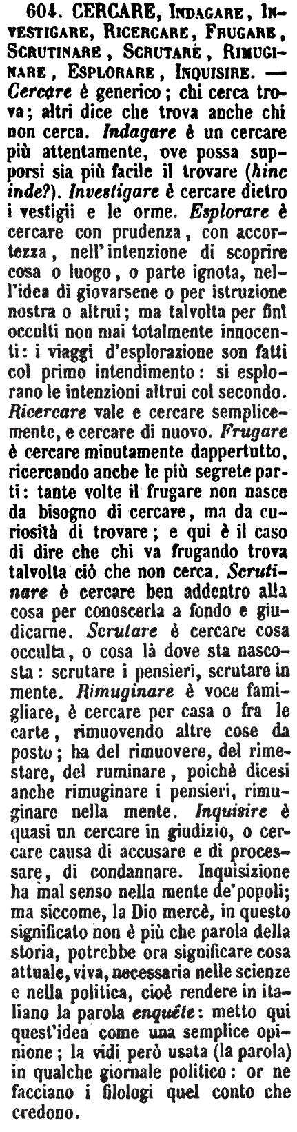 | Cercare, Indagare, Investigare, Ricercare, Frugare, Scrutinare, Scrutare, Rimuginare, Esplorare, Inquisire - Cercare è generico; chi cerca trova; altri dice che trova anche chi non cerca. Indagare è un cercare più attentamente, ove possa supporsi sia più facile il trovare (hinc inde?). Investigare è cercare dietro i vestigii e le orme. Esplorare è cercare con prudenza, con accortezza, nell'intenzione di scoprire cosa o luogo, o parte ignota, nell'idea di giovarsene o per istruzione nostra o altrui; ma talvolta per fini occulti non mai totalmente innocenti: i viaggi d'splorazione son fatti col primo intendimento: si esplorano le intenzioni altrui col secondo. Ricercare vale e cercare semplicemente, e cercare di nuovo. Frugare è cercare minutamente dappertutto, ricercando anche le più segrete parti: tante volte il frugare non nasce da bisogno di cercare, ma da curiosità di trovare; e qui è il caso di dire che chi va frugando trova talvolta ciò che non cerca. Scrutinare è cercare ben addentro alla cosa per conoscerla a fondo e giudicarne. Scrutare è cercare cosa occulta, o cosa là dove sta nascosta: scrutare i pensieri, scrutare in mente. Rimuginare è voce famigliare, è cercare per casa o fra le carte, rimuovendo altre cose da posto; ha del rimuovere, del rimestare, del ruminare, poichè dicesi anche rimuginare i pensieri, rimuginare nella mente. Inquisire è quasi un cercare in giudizio, o cercare causa di accusare e di processare, di condannare. Inquisizione ha mal senso nella mente de' popoli; ma siccome, la Dio mercè, in questo significato non è più che parola della storia, potrebbe ora significare cosa attuale, viva, necessaria nelle scienze e nella politica, cioè rendere in italiano la parola enquête: metto qui quest'idea come una semplice opinione; la vidi però usata (la parola) in qualche giornale politico: or ne facciano i filologi quel conto che credono. [immagine] |