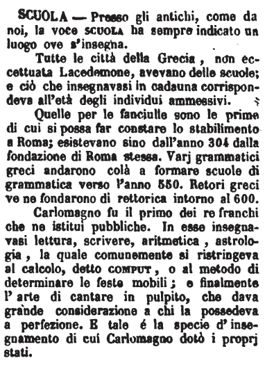 Tutte le città della Grecia, non eccettuata Lacedemone, avevano delle scuole; e ciò che insegnavasi in cadauna corrispondeva all'età degli individui ammessivi. Quelle per le fanciulle sono le prime di cui si possa far constare lo stabilimento a Roma; esistevano sino dall'anno 304 dalla fondazione di Roma stessa. Varj grammatici greci andarono colà a formare scuole di grammatica verso l'anno 550. Retori greci ve ne fondarono di rettorica intorno al 600. Carlomagno fu il primo dei re franchi che ne istituì pubbliche. In esse insegnavasi lettura, scrivere, aritmetica, astrologia, la quale comunemente si ristringeva al calcolo, detto comput, o al metodo di determinare le feste mobili; e finalmente l'arte di cantare in pulpito, che dava grande considerazione a chi la possedeva a perfezione. E tale é la specie d'insegnamento di cuí Carlomagno dotò i proprj stati. [immagine] |