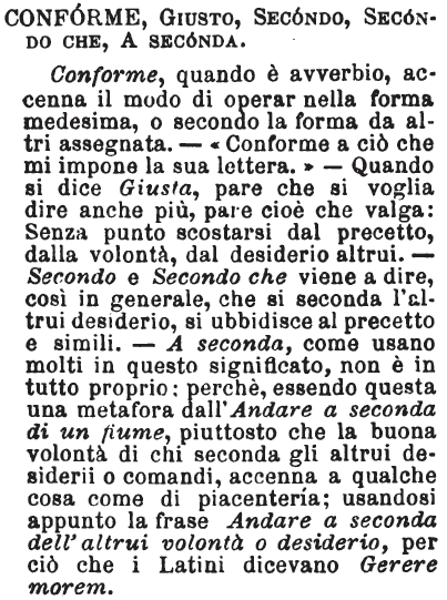 Conforme, Giusto, Secondo, Secondo che, A seconda - Conforme, quando è avverbio, accenna il modo di operar nella forma medesima, o secondo la forma da altri assegnata. - «Conforme a ciò che mi impone la sua lettera.» - Quando si dice Giusta, pare che si voglia dire anche più, pare cioè che valga: Senza punto scostarsi dal precetto, dalla volontà, dal desiderio altrui. - Secondo e Secondo che viene a dire, così in generale, che si seconda l'altrui desiderio, si ubbidisce al precetto e simili. - A seconda, come usano molti in questo significato, non è in tutto proprio: perchè, essendo questa una metafora dall'Andare a seconda di un fiume, piuttosto che la buona volontà di chi seconda gli altrui desiderii o comandi, accenna a qualche cosa come di piacenterìa; usandosi appunto la frase Andare a seconda dell'altrui volontà o desiderio, per ciò che i Latini dicevano Gerere morem. [immagine]