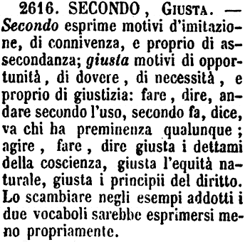 Secondo, Giusta - Secondo esprime motivi d'imitazione, di connivenza, e proprio di assecondanza; giusta motivi di opportunità, di dovere, di necessità, e proprio di giustizia: fare, dire, andare secondo l'uso, secondo fa, dice, va chi ha preminenza qualunque; agire, fare, dire giusta i dettami della coscienza, giusta l'equità naturale, giusta i principii del diritto. Lo scambiare negli esempi addotti i due vocaboli sarebbe esprimersi meno propriamente. [immagine]