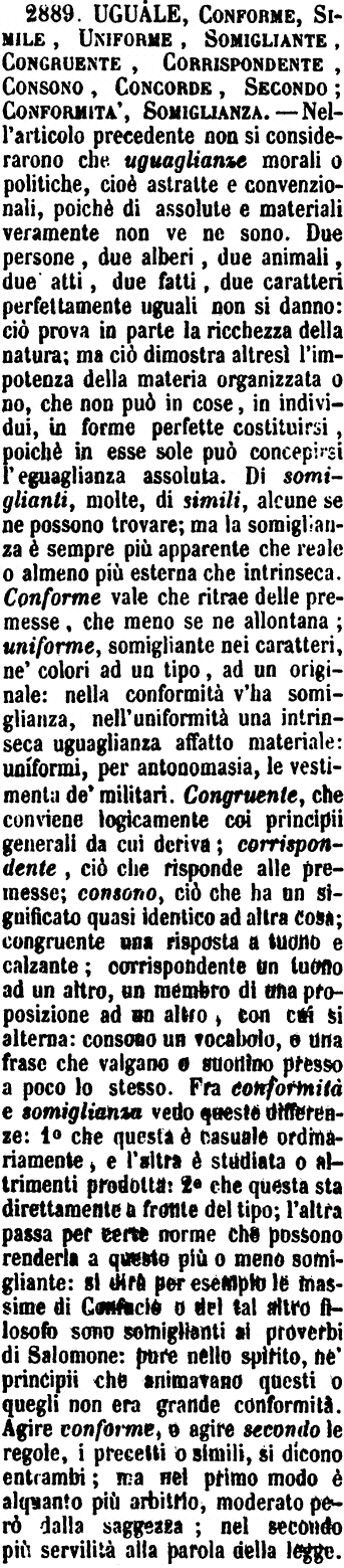 Uguale, Conforme, Simile, Uniforme, Somigliante, Congruente, Corrispondente, Consono, Concorde, Secondo; Conformità, Somiglianza - Nell'articolo precedente non si considerarono che uguaglianze morali o politiche, cioè astratte e convenzionali, poichè di assolute e materiali veramente non ve ne sono. Due persone, due alberi, due animali, due atti, due fatti, due caratteri perfettamente uguali non si danno: ciò prova in parte la ricchezza della natura; ma ciò dimostra altresì l'impotenza della materia organizzata o no, che non può in cose, in individui, in forme perfette costituirsi, poichè in esse sole può concepirsi l'eguaglianza assoluta. Di somiglianti, molte, di simili, alcune se ne possono trovare; ma la somiglianza è sempre più apparente che reale o almeno più esterna che intrinseca. Conforme vale che ritrae delle premesse, che meno se ne allontana; uniforme, somigliante nei caratteri, ne' colori ad un tipo, ad un originale: nella conformità v'ha somiglianza, nell'uniformità una intrinseca uguaglianza affatto materiale: uniformi, per antonomasia, le vestimenta de' militari. Congruente, che conviene logicamente coi principii generali da cui deriva; corrispondente, ciò che risponde alle premesse; consono, ciò che ha un significato quasi identico ad altra cosa; congruente una risposta a tuono e calzante; corrispondente un tuono ad un altro, un membro di una proposizione ad un altro, con cui si alterna: consono un vocabolo, o una frase che valgano o suonino presso a poco lo stesso. Fra conformità e somiglianza vedo queste differenze: 1° che questa è casuale ordinariamente, e l'altra è studiata o altrimenti prodotta: 2° che questa sta direttamente a fronte del tipo; l'altra passa per certe norme che possono renderla a questo più o meno somigliante: si dirà per esempio le massime di Confucio o del tal altro filosofo sono somiglianti ai proverbi di Salomone: pure nello spirito, ne' principii che animavano questi o quegli non era grande conformità. Agire conforme, e agire secondo le regole, i precetti o simili, si dicono entrambi; ma nel primo modo è alquanto più arbitrio, moderato però dalla saggezza; nel secondo più servilità alla parola della legge. [immagine]