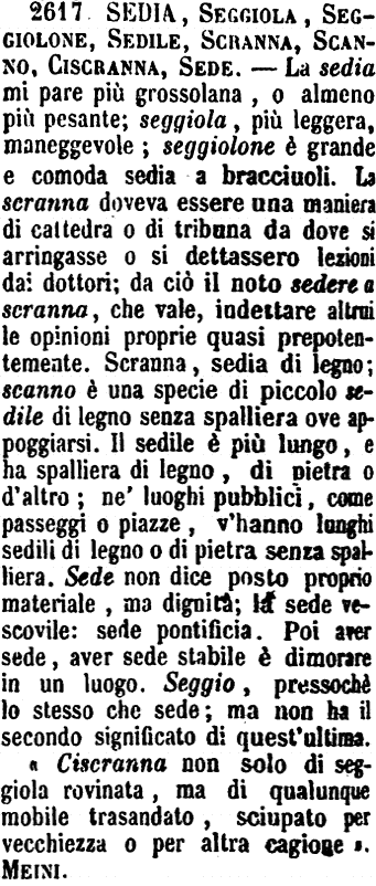 | Sedia, Seggiola, Seggiolone, Sedile, Scranna, Scanno, Ciscranna, Sede - La sedia mi pare più grossolana, o almeno più pesante; seggiola, più leggera, maneggevole; seggiolone è grande e comoda sedia a bracciuoli. La scranna doveva essere una maniera di cattedra o di tribuna da dove si arringasse o si dettassero lezioni dai dottori; da ciò il noto sedere a scranna, che vale, indettare altrui le opinioni proprie quasi prepotentemente. Scranna, sedia di legno; scanno è una specie di piccolo sedile di legno senza spalliera ove appoggiarsi. Il sedile è più lungo, e ha spalliera di legno, di pietra o d'altro; ne' luoghi pubblici, come passeggi o piazze, v'hanno lunghi sedili di legno o di pietra senza spalliera. Sede non dice posto proprio materiale, ma dignità; la sede vescovile: sede pontificia. Poi aver sede, aver sede stabile è dimorare in un luogo. Seggio, pressochè lo stesso che sede; ma non ha il secondo significato di quest'ultima.